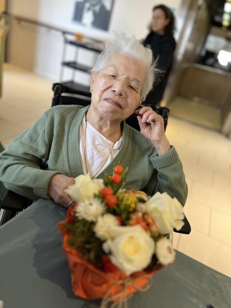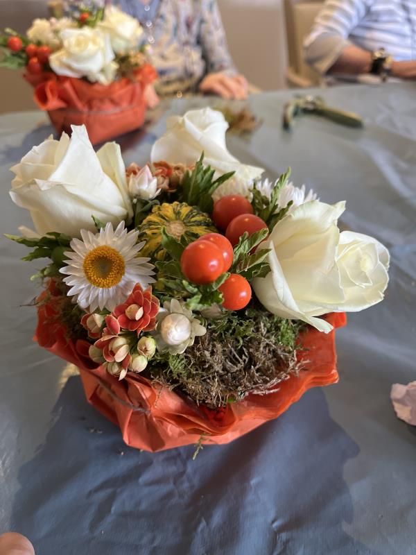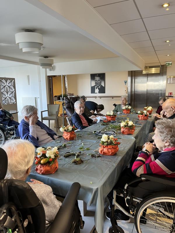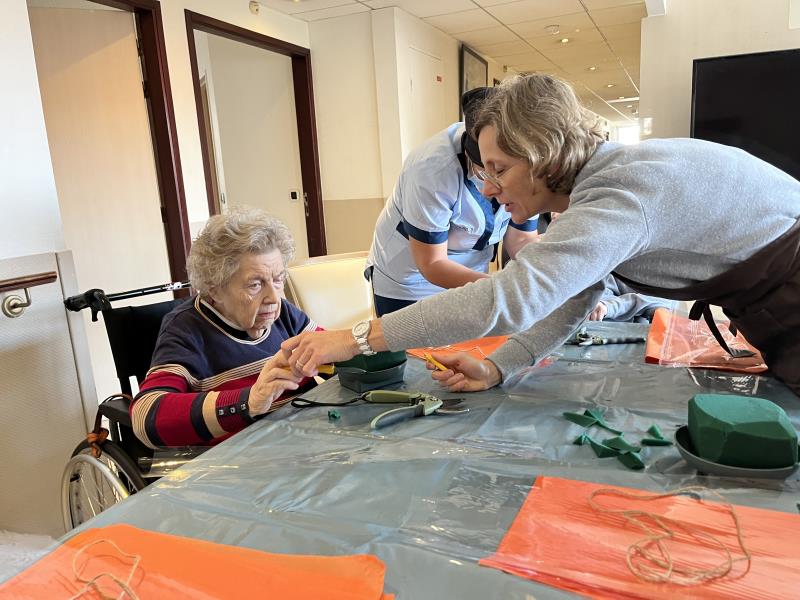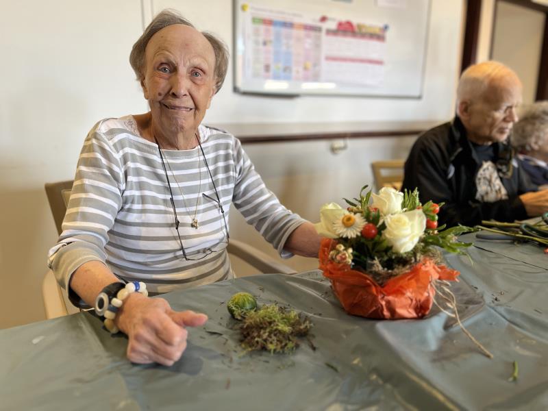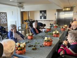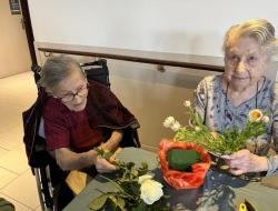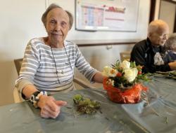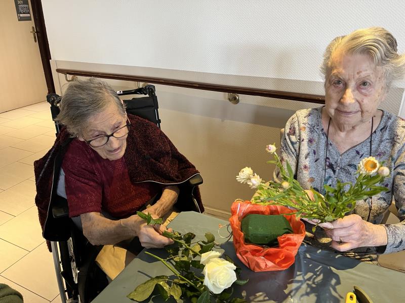 C’est toujours avec un grand plaisir que des résidentes rejoignent l’atelier Art Floral. « C’est tellement agréable le contact avec les fleurs ». Assembler, arranger, couper. « On peut juste regarder les autres travailler » C'est chouette de voir la progression des bouquets. Les Aides-soignantes viennent en soutient si besoin. Tout le monde passe un bon moment. Les Bouquets sont répartis dans les salons, la salle à manger, à l’accueil et à la bibliothèque.