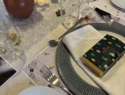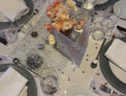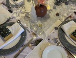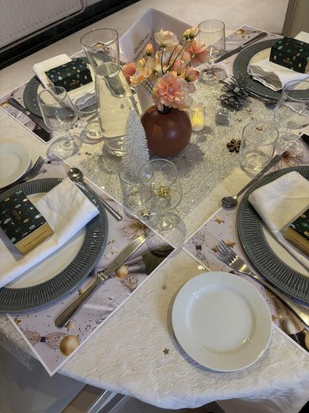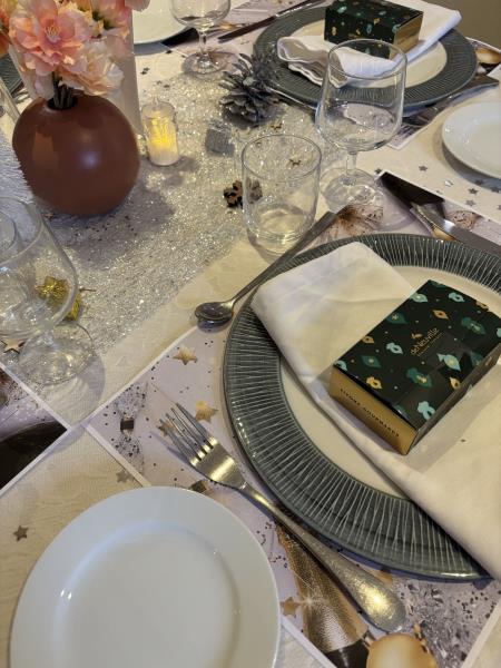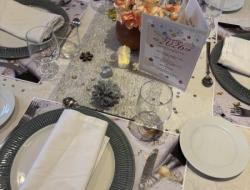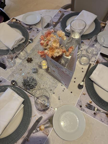 Les tables avaient été soigneusement dressées aux couleurs argent, doré et blanc, créant une atmosphère raffinée et chaleureuse. De petites bougies disposées sur les tables illuminaient la salle et renforçaient l’esprit de fête et de partage.