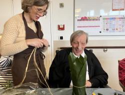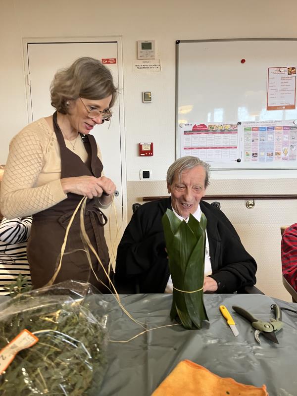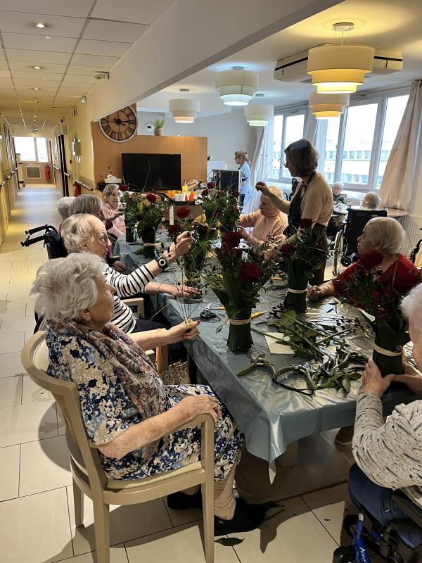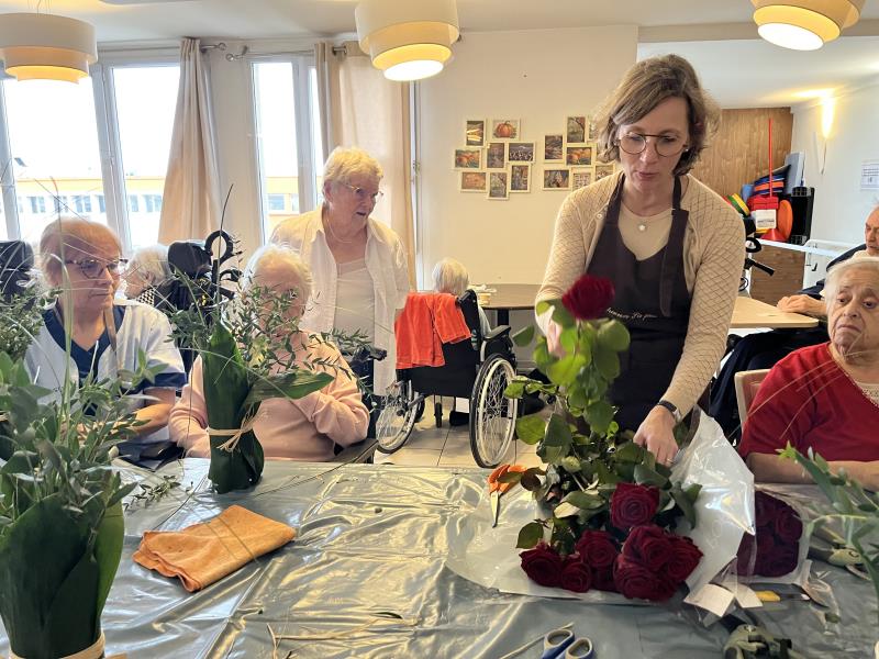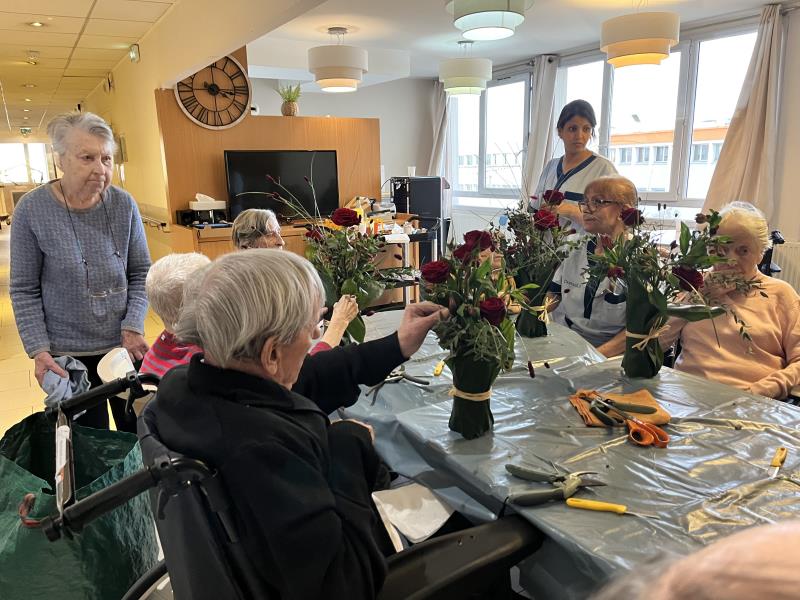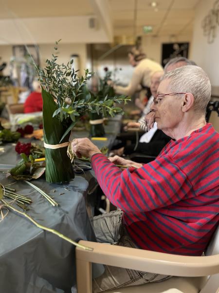 En relation avec des fleurs, notre corps perçoit, ressent de nouvelles sensations. Cette activité manuelle permet aux résidentes et résidents de vivre dans le moment présent en se concentrant sur les couleurs, les textures des fleurs et des feuillages. C’est le moment idéal pour exprimer sa créativité esthétique, guidés par Sophie qui encourage et valorise les habilités de chacun. C’est aussi la satisfaction d’avoir réalisé une composition florale.