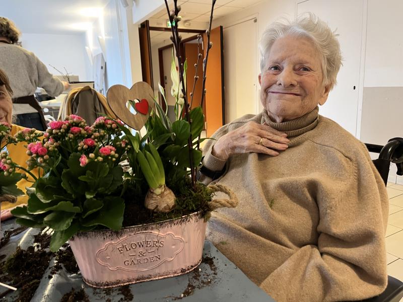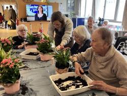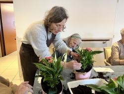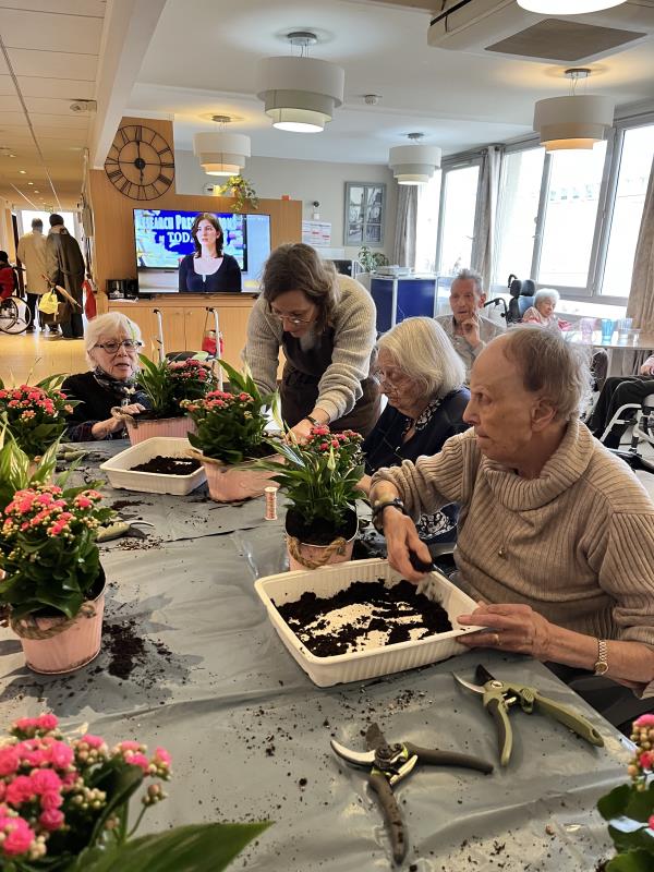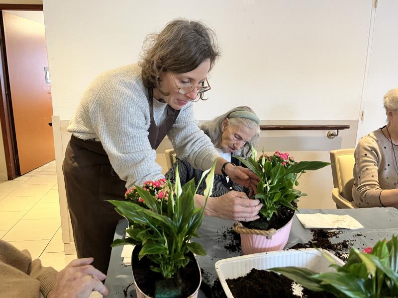 Tous les deux mois, les résidents participent à un atelier d’art floral animé par Sophie, intervenante passionnée. Guidés étape par étape, ils réalisent une même composition à partir d’un choix de fleurs et de feuillages, favorisant la concentration, la motricité fine et le plaisir de créer ensemble.