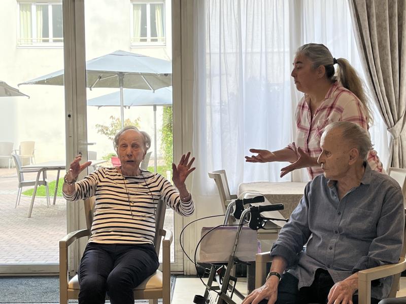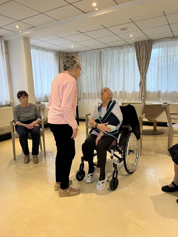 Et oui le moteur c’est la bonne humeur ! Les résidents se prêtent aux jeux, aux mises en scène proposées par Cécile qui facilite et encourage l’expression de chacun !